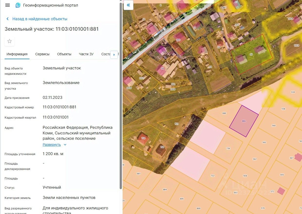 Земельный участок с кадастровым номером 11:03:0101001:881 из состава земель населенных пунктов, площадью 1200 кв. м, с видом разрешенного использования для индивидуального жилищного строительства, расположенного по адресу: Российская Федерация, Республика Коми, Сысольский муниципальный район, сельское поселение Визинга, с. Визинга, микрорайон Южный