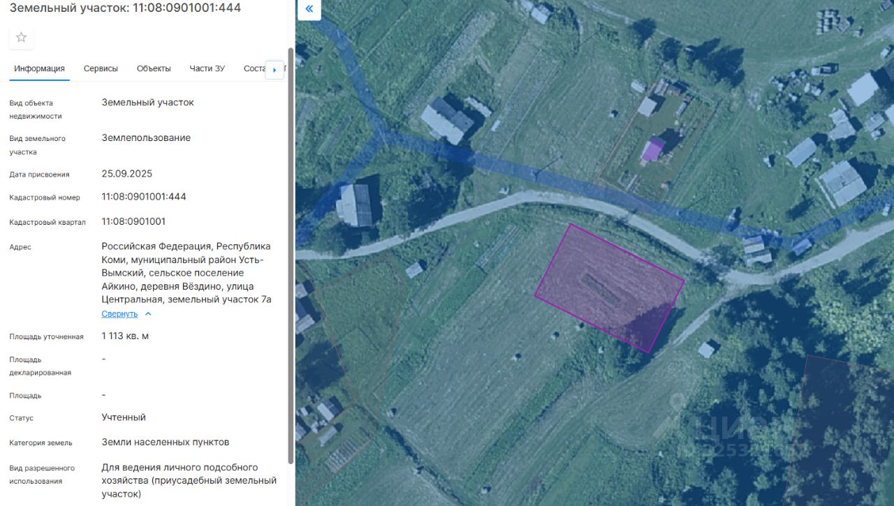 Земельный участок из земель населенных пунктов с кадастровым номером 11:08:0901001:444, расположенный по адресу: Российская Федерация, Республика Коми, муниципальный район Усть-Вымский, сельское поселение Айкино, деревня Вёздино, улица Центральная, земельный участок 7а, с видом разрешенного использования: для ведения личного подсобного хозяйства (приусадебный земельный участок), площадью 1113 кв.м. Обременения и ограничения земельного участка отсутствуют. Права на земельный участок: государственная собственность не разграничена. Земельный участок не заложен, не является предметом спора, свободен от прав третьих лиц.