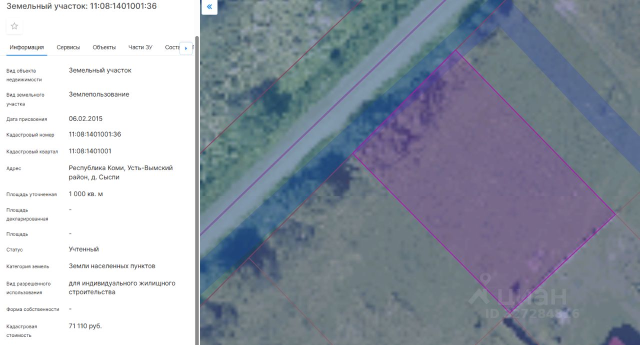 Земельный участок, государственная собственность на который не разграничена, из земель населенных пунктов с кадастровым номером 11:08:1401001:36, площадью 1000 кв.м., расположенный по адресу: Российская Федерация, Республика Коми, муниципальный район Усть-Вымский, сельское поселение Айкино, деревня Сыспи, микрорайон Новый, земельный участок 6, с видом разрешенного использования: для индивидуального жилищного строительства.В отношении земельного участка установлены ограничения прав на земельный участок, предусмотренные статьей 56 Земельного кодекса РФ с 19.06.2019 года, и в соответствии с постановлением Правительства РФ от 24.02.2009 160 "О порядке установления охранных зон объектов электросетевого хозяйства и особых условий использования земельных участков, расположенных в границах таких зон" ограничения в использовании земельного участка , расположенной в границах охранной зоны объекта "ВЛ-0,4 кВ ф.1 КТП 1101 д. Сыспи" с реестровым номером границ 11:08-6.569.