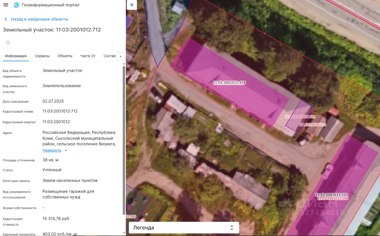 Земельный участок с кадастровым номером 11:03:2001012:712 из состава земель населенных пунктов, площадью 38 кв. м, с видом разрешенного использования размещение гаражей для собственных нужд, расположенный по адресу: Российская Федерация, Республика Коми, Сысольский муниципальный район, сельское поселение Визинга, с. Визинга, ул. Оплеснина