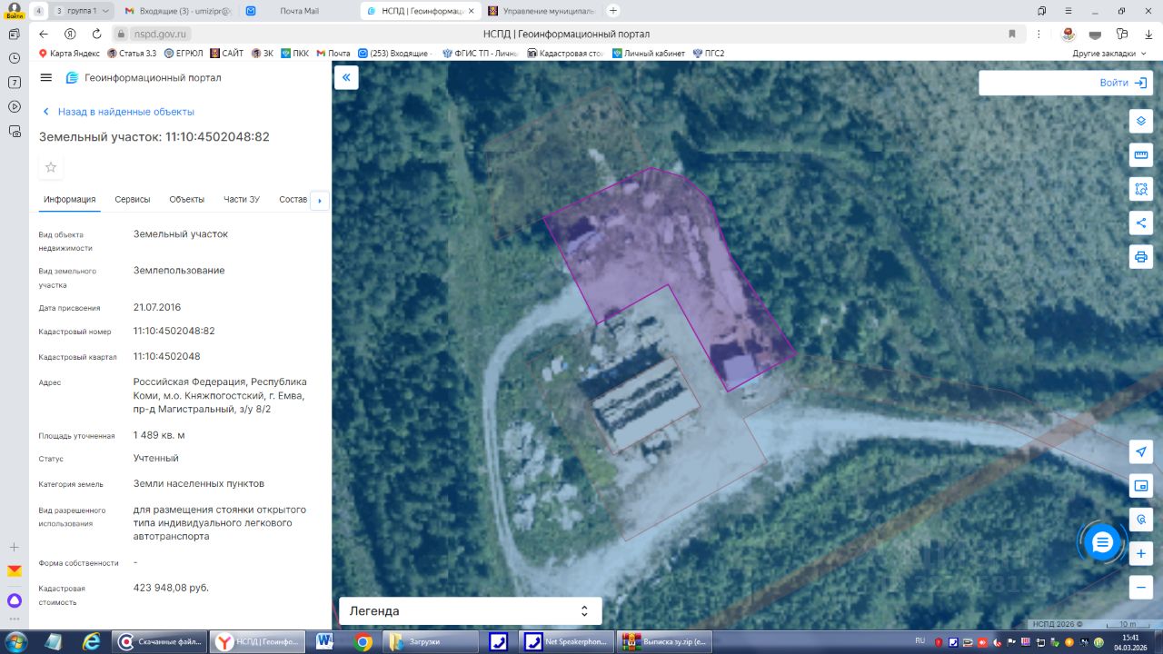 Земельный участок с кадастровым номером 11:10:4502048:82, общей площадью 1489,0 кв.м. расположенный по адресу: Российская Федерация, Республика Коми, м.о. Княжпогостский, г. Емва, проезд Магистральный, з/у 8/2, в территориальной зоне О-1 (Многофункциональная деловая зона), вид разрешённого использования: для размещения стоянки открытого типа индивидуального легкового автотранспорта.