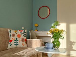 • Современный интерьер с нежными пастельными оттенками и яркими акцентами.