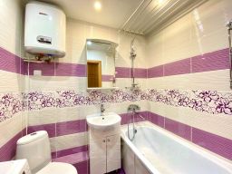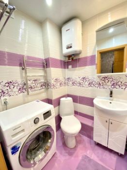 Ванная комната оборудована ванной и стиральной машиной. Для гостей предоставляются предметы гигиены входящие в стоимость проживания (по два полотенца на каждого гостя, жидкое мыло, гель для душа, шампунь и стиральный