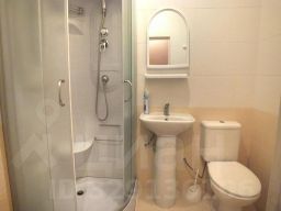 В номере двуспальная кровать, диван, кресло, телевизор, телефон, чайник, журнальный столик, прихожая с зеркалом, шкаф-пенал для вещей. Ванная комната оборудована душем.