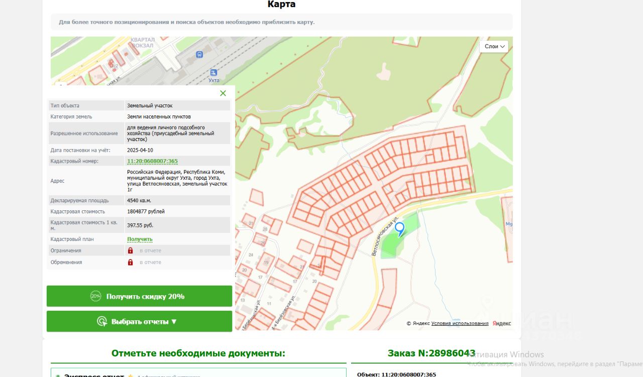 Земельный участок с кадастровым номером 11:20:0608007:365, площадью 4540 кв.м, вид разрешенного использования для ведения личного подсобного хозяйства (приусадебный земельный участок), расположенного по адресу: Российская Федерация, Республика Коми, муниципальный округ Ухта, город Ухта, улица Ветлосяновская, земельный участок 1г