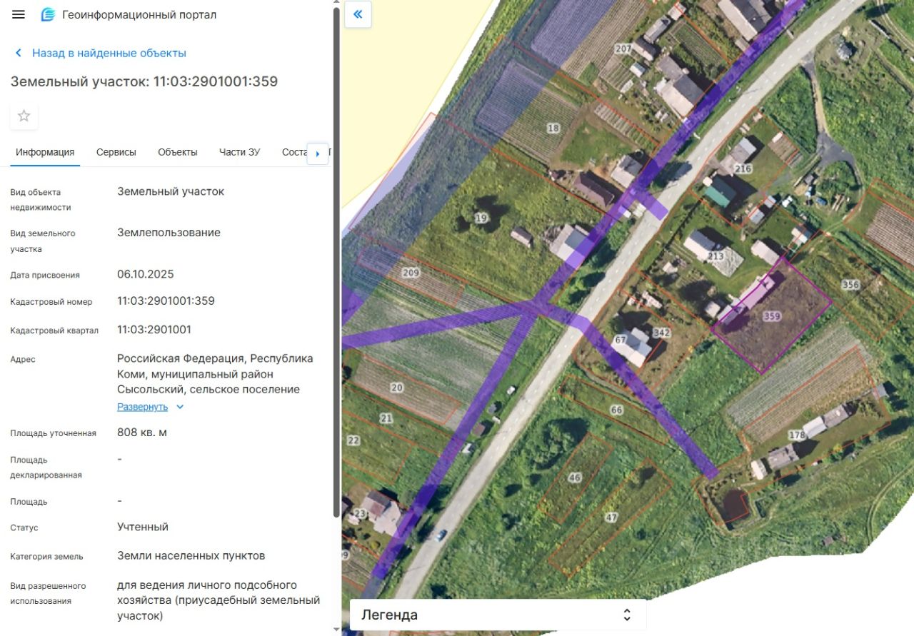 Земельный участок с кадастровым номером 11:03:2901001:359 из состава земель населенных пунктов, площадью 808 кв.м, с разрешенным использованием для ведения личного подсобного хозяйства (приусадебный земельный участок), расположенный по адресу: Российская Федерация, Республика Коми, муниципальный район Сысольский, сельское поселение Визинга, деревня Сорд.