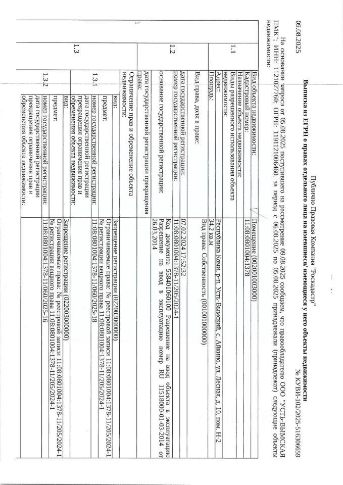 (45-19-25) Нежилое помещение площадью 34,20 кв.м., расположенное по адресу: Республика Коми, Усть-Вымский район, с.Айкино, ул. Лесная, д. 10, пом. Н-2, кадастровый номер: 11:08:0801004:1378. Должник ООО "Усть-Вымская ПМК". Начальная цена: 413 525 рублей. Обременение: арест.