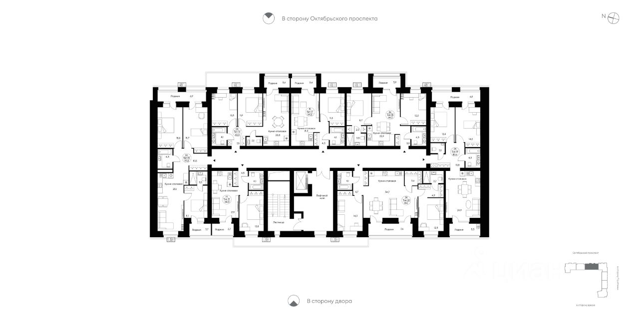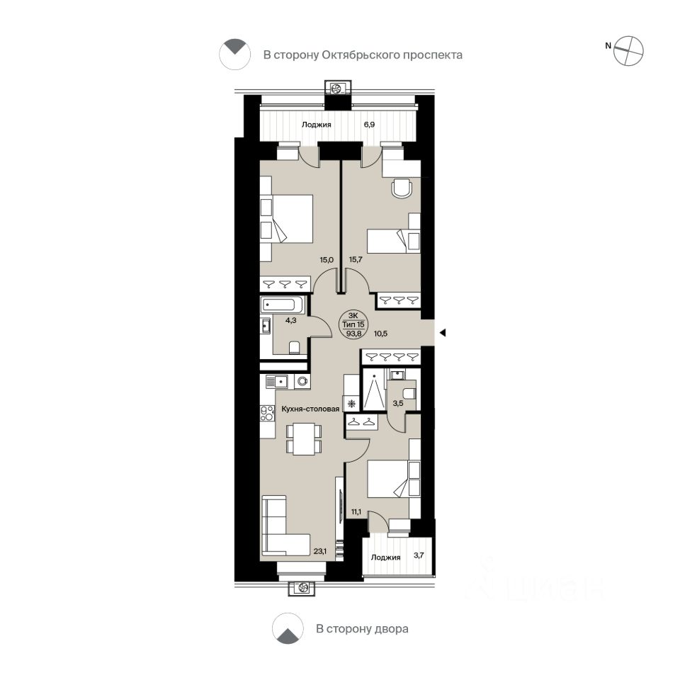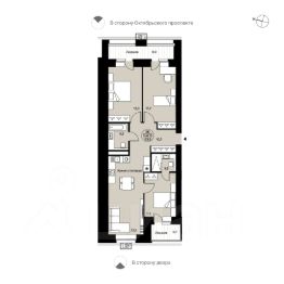 Трёхкомнатная квартира 159 свободной планировки. Три спальни, просторная кухня-столовая (23,1 м²). Лоджия (3,7 м²) с выходом из первой спальни — с панорамным остеклением. Выходы на вторую лоджию (6,9 м²) с остеклением на кирпичной кладке (30 60 см, высота безопасности и тонирования стекла — 1,2 м) из двух спален. Два с/у, места для хранения, есть возможность сделать одну из комнат мастер-спальней. Вид в сторону Октябрьского пр-та и во двор.