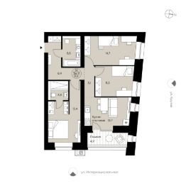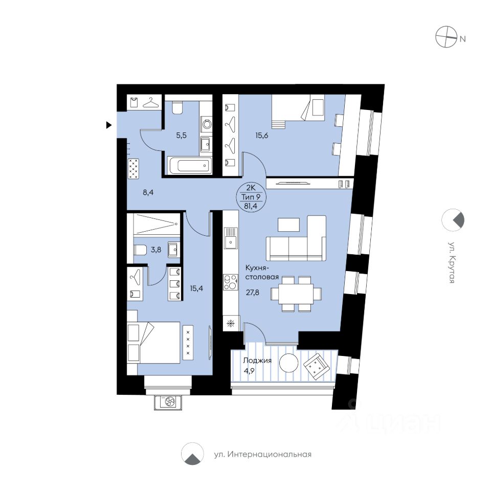 Двухкомнатная квартира 9 от застройщика в доме "Символ". Свободная планировка. Место для системы хранения в коридоре, просторная кухня-столовая (27,8 м²) с двумя окнами и французским выходом на лоджию, комнаты необычной скошенной формы, две разнесённые спальни с местами для систем хранения и широкими окнами, два совмещенных с/у и возможность организовать мастер-спальню. Вид в сторону ул. Крутой и Интернациональной.