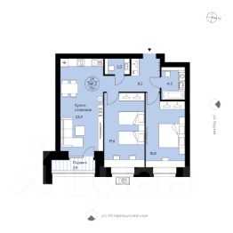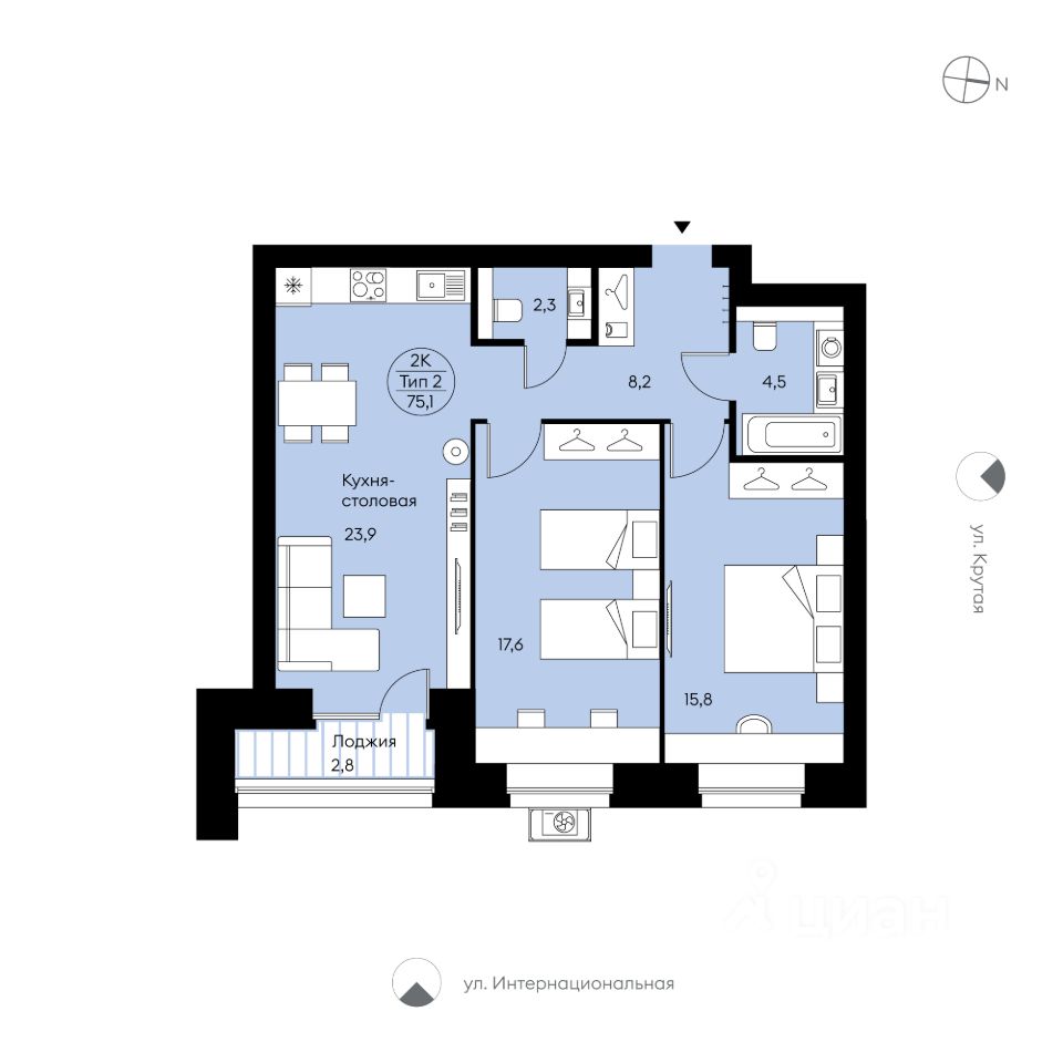 Двухкомнатная квартира 42 от застройщика в доме "Символ". Свободная планировка. Место для системы хранения в коридоре, просторная кухня-столовая (23,9 м²) с французским выходом на лоджию, две комнаты с местами для систем хранения и широкими окнами, два совмещенных с/у и возможность организовать мастер-спальню. Вид в сторону ул. Интернациональной.