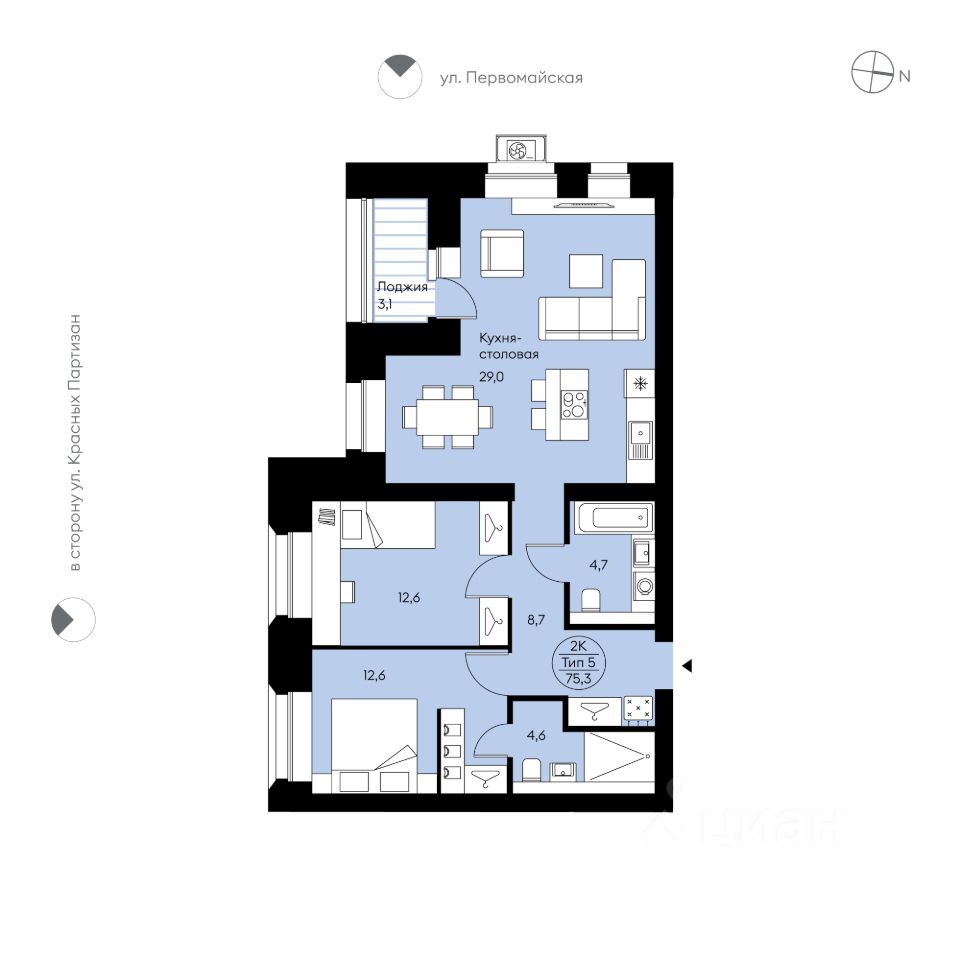 Двухкомнатная квартира 45 от застройщика в доме "Символ". Свободная планировка. Прихожая с нишей для системы хранения, просторная кухня-столовая (29 м²) с тремя окнами и выходом на лоджию, две комнаты с местами для систем хранения и широкими окнами, два совмещенных с/у и возможность организовать мастер-спальню. Вид во двор и в сторону ул. К. Партизан.