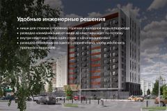 В квартире один стояк — канализации, стояки холодного и горячего водоснабжения, а также отопления — в нишах подъезда. Коммуникации заведены в квартиру. Установлены качественные толстые (80 мм) металлические двери, экран для кондиционера, современные радиаторы. Система умного здания с IP-домофонией, автоматическая передача показателей счётчиков (вода, тепло, электричество), мобильное приложение жителя.