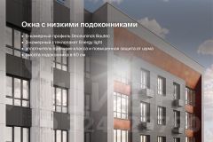 Толщина кирпичной кладки — 510 мм (с вентфасадом — до 920 мм). Высота потолков — 2,7 м, на 11-12-х этажах — 3 м. Окна с низкими подоконниками (60 см от пола) и энергоэффективным остеклением. Низкие коммунальные платежи благодаря наивысшему классу энергоэффективности А++.