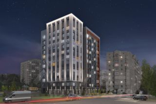 Здание башенного типа с вечерней подсветкой необычной отделкой из облицовочного кирпича и композита в природных тонах.