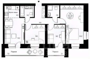 Квартира расположена на 2-м этаже. Общая площадь квартиры 83,7 м2 - кухня-гостиная, 3 комнаты правильной формы и 2 санузла. Состояние - черновая отделка.