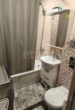 По всей квартире натяжные потолки, ламинат, на кухне и коридоре плитка. Санузел совмещён, на полу и стенах кафель, теплые полы в период отопления.