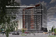 В квартире один стояк — канализации, стояки холодного и горячего водоснабжения, а также отопления — в нишах подъезда. Коммуникации заведены в квартиру. Установлены качественные толстые (80 мм) металлические двери, экран для кондиционера, современные радиаторы. Система умного здания с IP-домофонией, автоматическая передача показателей счётчиков (вода, тепло, электричество), мобильное приложение жителя.