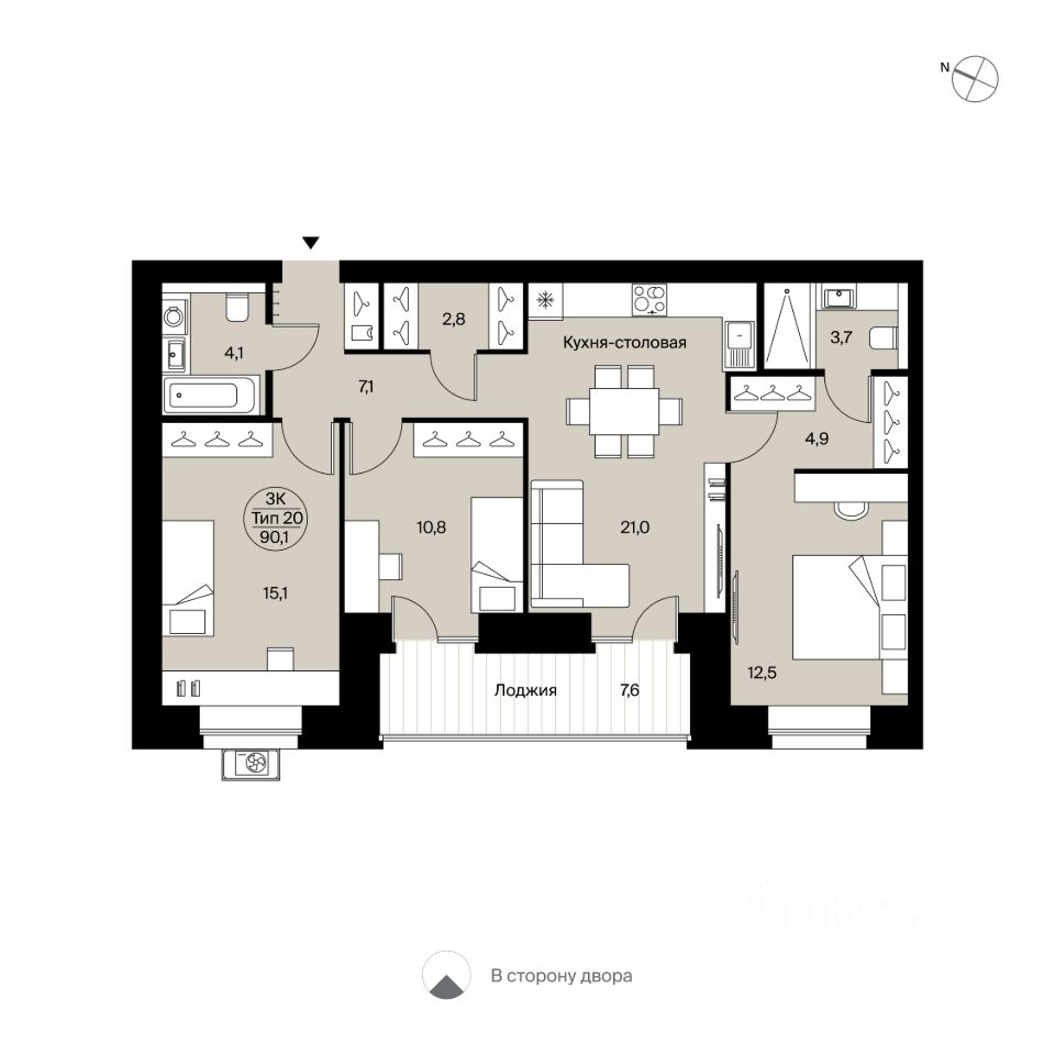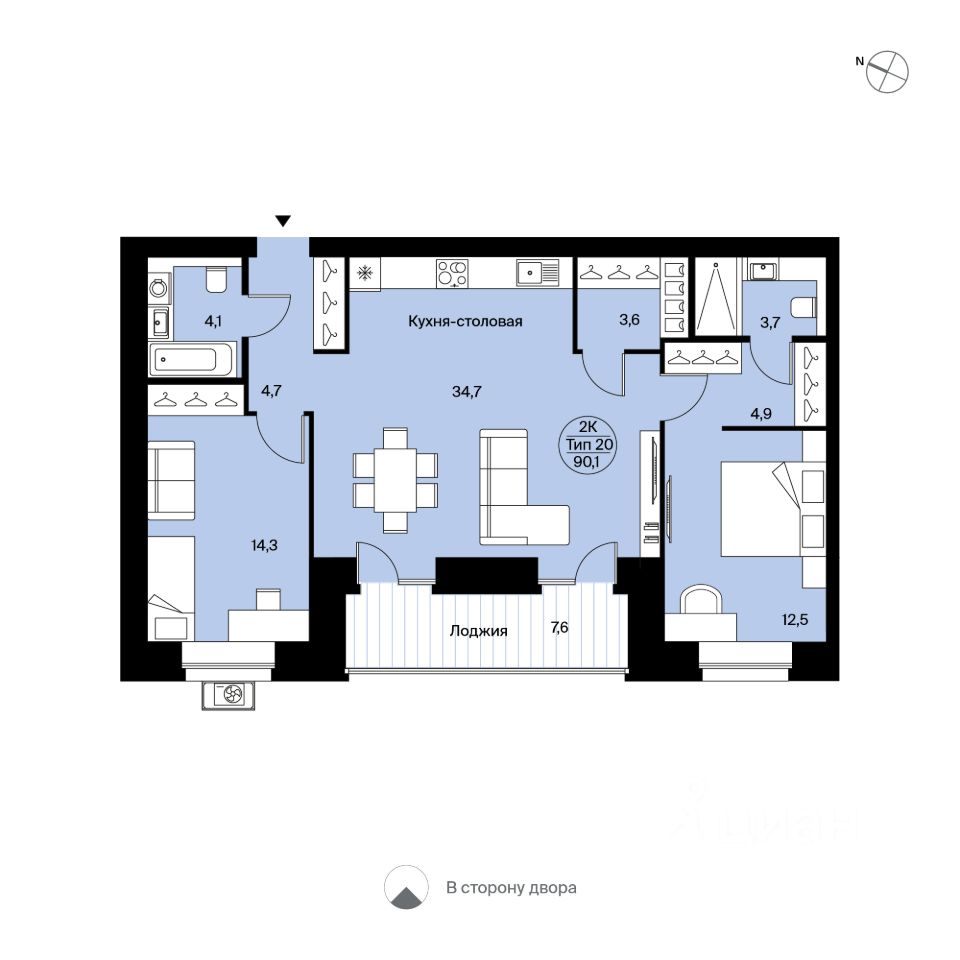 Двухкомнатная квартира 171 свободной планировки. Очень просторная кухня-столовая (34,7 м²) с двумя французскими выходами на лоджию (7,6 м²) с панорамным остеклением. Места для систем хранения, кладовая и гардеробная комнаты, два с/у. Есть возможность сделать одну из комнат мастер-спальней. Вид во двор.