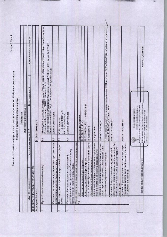 (57-03-25) Жилое помещение (комната) общей площадью 10, 6 кв. м. , расположенное по адресу: Республика Коми, г. УХТА, ш-г. Водный, ул. Ленина, д. 36, к. этаж 2, кадастровый номер:11:20:0801001:5057, Задолженность собственника по взносам за капитальный ремонт ма 03. 12. 2025 — 6 395, 22 руб. Зарегистрирован 1 взр. Должник Шишадская Л. П. Начальная цена: 190 800 рублей. Обременение арест.