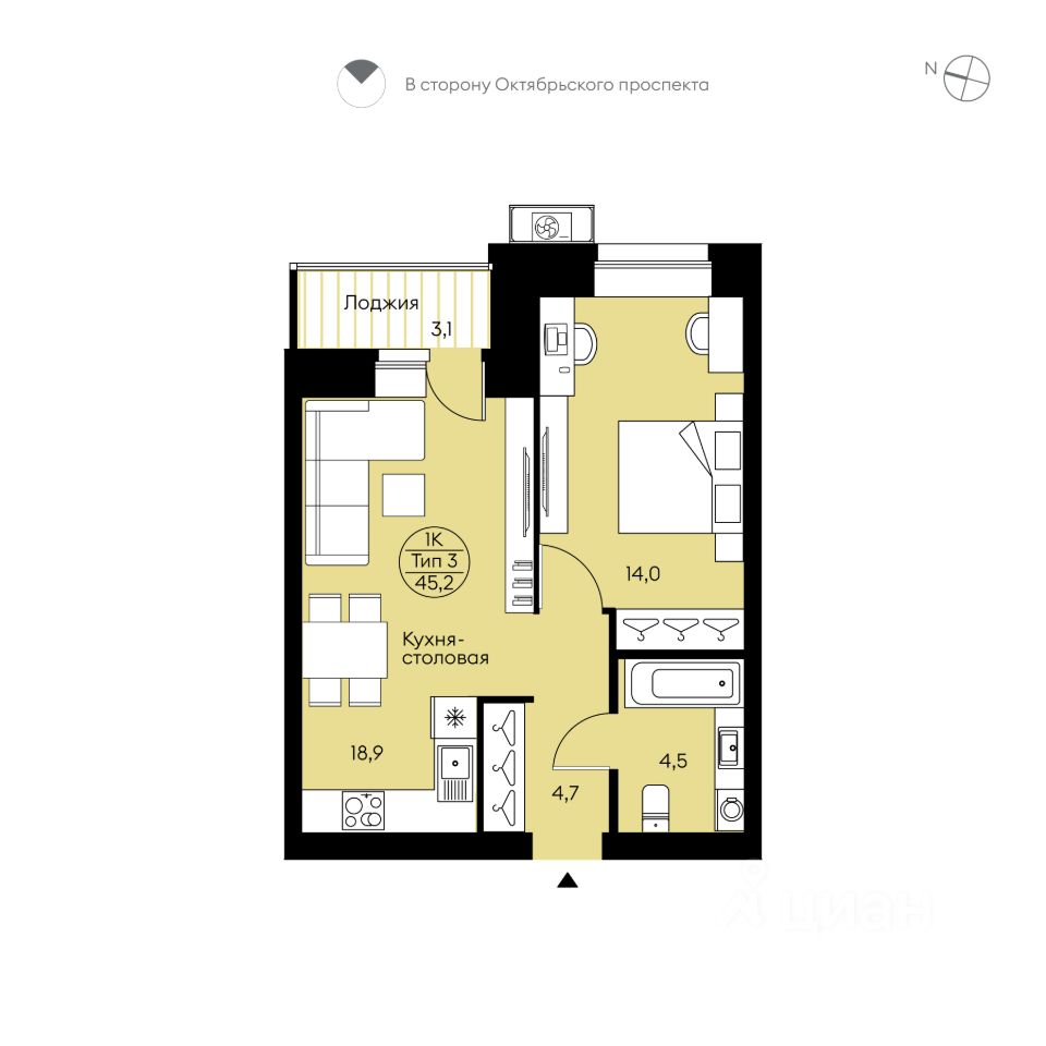 Общая площадь45,2 м²