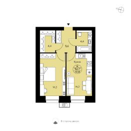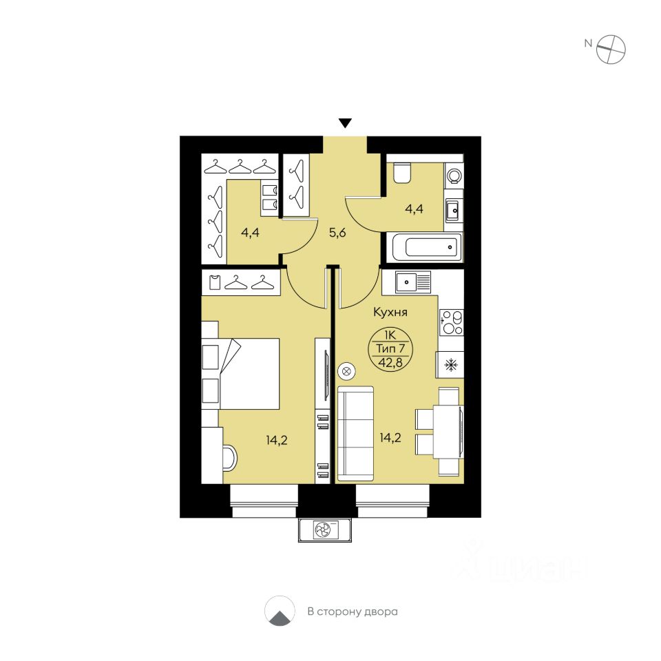 Однокомнатная квартира свободной планировки. Отдельные кухня и спальня с большими окнами с низкими подоконниками. Гардероб, большой совмещенный с/у. Вид во двор.