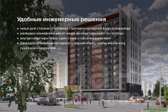 В квартире один стояк — канализации, стояки холодного и горячего водоснабжения, а также отопления — в нишах подъезда. Коммуникации заведены в квартиру. Установлены качественные толстые (80 мм) металлические двери, экран для кондиционера, современные радиаторы. Система умного здания с IP-домофонией, автоматическая передача показателей счётчиков (вода, тепло, электричество), мобильное приложение жителя.