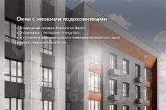 Толщина кирпичной кладки — 510 мм (с вентфасадом — до 920 мм). Высота потолков — 2,7 м, на 11-12-х этажах — 3 м. Окна с низкими подоконниками (60 см от пола) и энергоэффективным остеклением. Низкие коммунальные платежи благодаря наивысшему классу энергоэффективности А++.