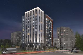 Здание башенного типа с вечерней подсветкой необычной отделкой из облицовочного кирпича и композита в природных тонах.