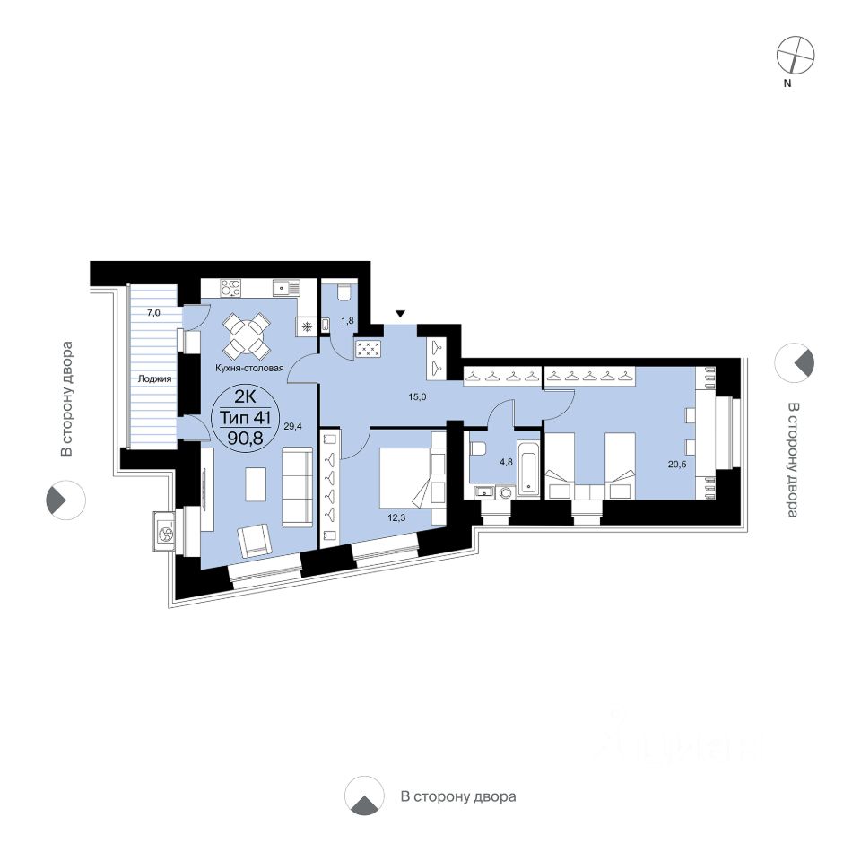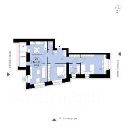 Двухкомнатная квартира 390 свободной планировки. Просторная кухня-столовая (29,4 м²) с двумя выходами на панорамную лоджию (7 м²) и эффектными окнами (проем от 2 до 2,2 м шириной). Просторная прихожая, места для систем хранения, два с/у с окном в одном из них. Разнесенные спальни повышают комфорт и приватность. Вид во двор и в сторону "Июня".