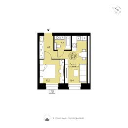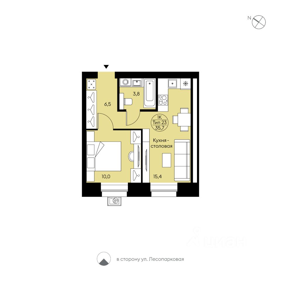 Однокомнатная квартира свободной планировки. Просторная кухня-столовая, совмещённый с/у, места для систем хранения, отдельная спальня, большие окна с низкими подоконниками. Вид в сторону ул. Лесопарковой.