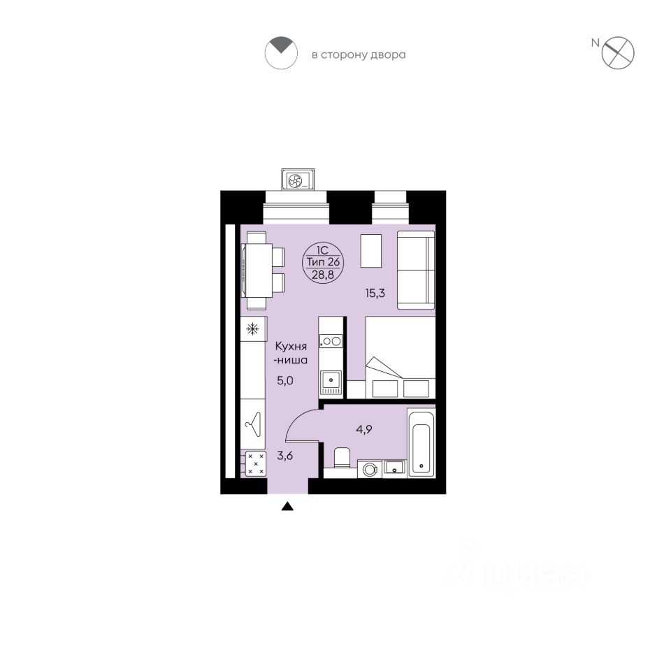 Студия свободной планировки. Два окна с низкими подоконниками. Прихожая с местом для системы хранения, просторный совмещённый с/у, кухня-ниша. Вид во двор, в сторону ул. Морозова.