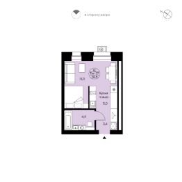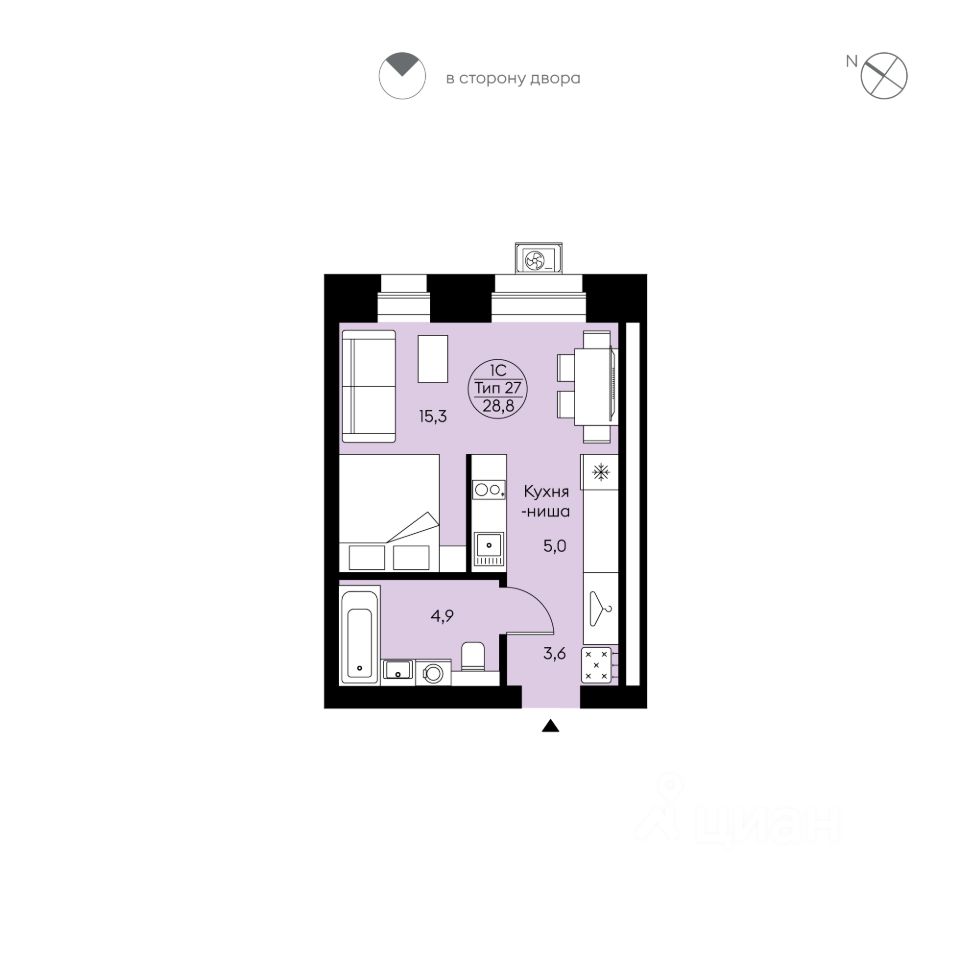 Студия свободной планировки. Два окна с низкими подоконниками. Прихожая с местом для системы хранения, просторный совмещённый с/у, кухня-ниша. Вид во двор, в сторону ул. Морозова.