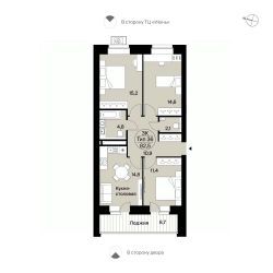 Трёхкомнатная квартира 433 свободной планировки. Три спальни, кухня-столовая. Выходы на панорамную лоджию (8,7 м²) из кухни-столовой и одной из спален. Два санузла, места для хранения. Вид сторону "Июня" и во двор.