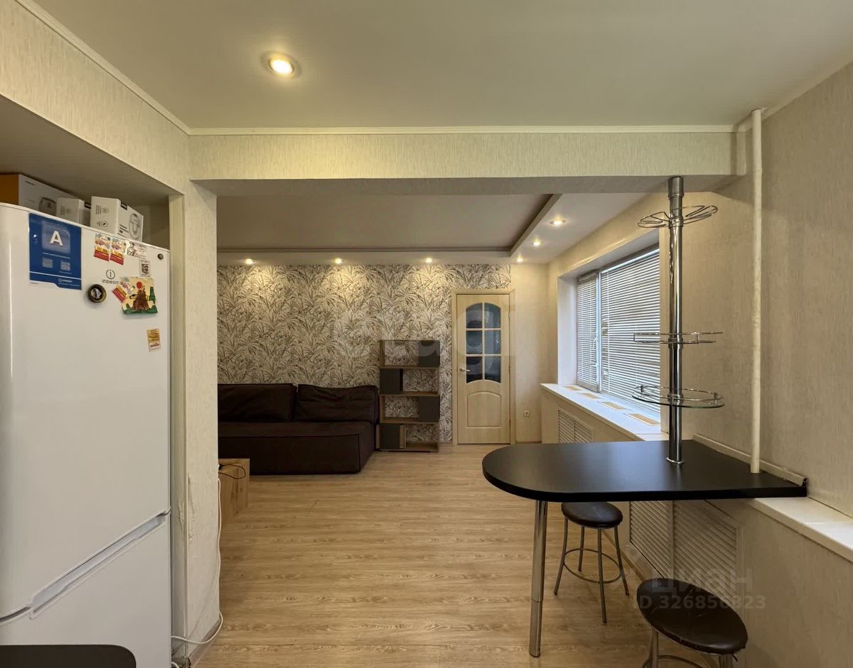 Кухня-гостиная очень просторная. Установлен встроенный кухонный гарнитур, стол с барной стойкой.