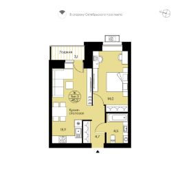 Однокомнатная квартира свободной планировки. Просторная кухня-столовая (18,9 м²) с выходом на лоджию (3,1 м²). Места для систем хранения, большой совмещенный с/у. Вид во двор. "Квартира от застройщика в уникальном разноуровневом тёплом кирпичном доме в Орбите. Подходит под семейную и льготную ипотеку. Ключи — IV кв. 2027г. Прямая сделка с застройщиком — гарантия безопасности.