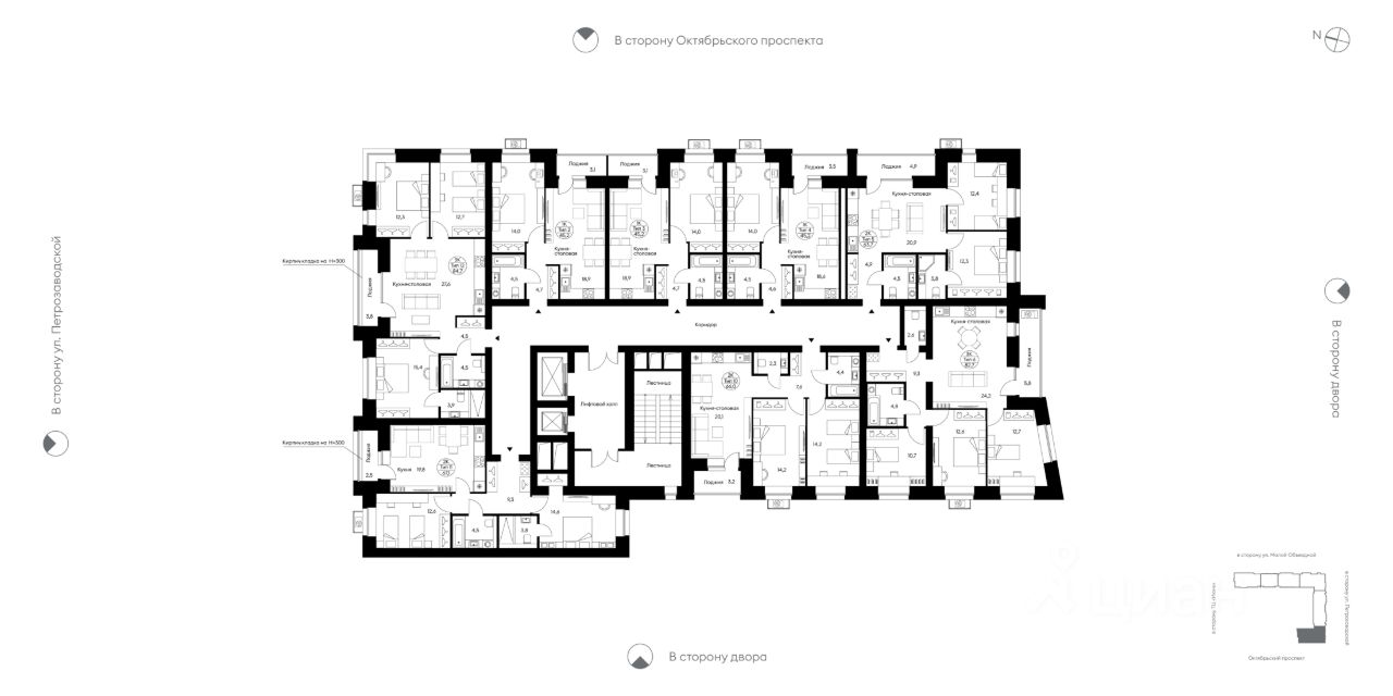 Секция из 14-ти этажей, до 8 квартир на площадке. Верхний этаж — хайфлэты — квартиры с увеличенными до трёх метров потолками. Подъезд на уровне земли, светопрозрачная входная группа, гостеприимный холл с колясочной. Два скоростных лифта. Тихий, безопасный двор с закрытой территорией, системой видеонаблюдения, ландшафтным дизайном, игровым и спортивным оборудованием. Парковка за пределами двора.