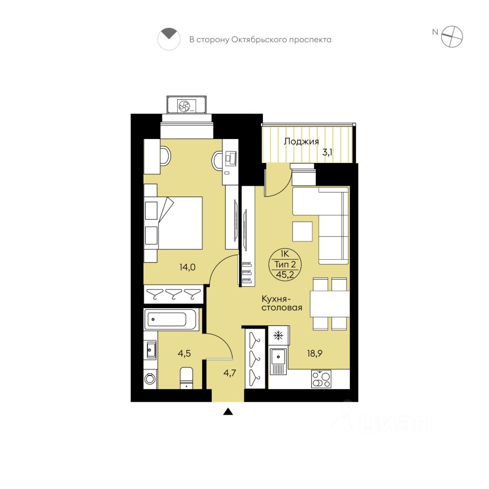 Однокомнатная квартира свободной планировки. Просторная кухня-столовая (18,9 м²) с выходом на лоджию (3,1 м²). Места для систем хранения, большой совмещенный с/у. Вид во двор. "Квартира от застройщика в уникальном разноуровневом тёплом кирпичном доме в Орбите. Подходит под семейную и льготную ипотеку. Ключи — IV кв. 2027г. Прямая сделка с застройщиком — гарантия безопасности.