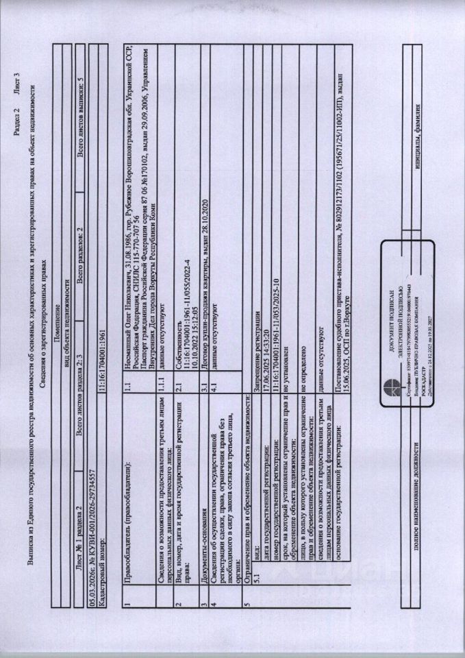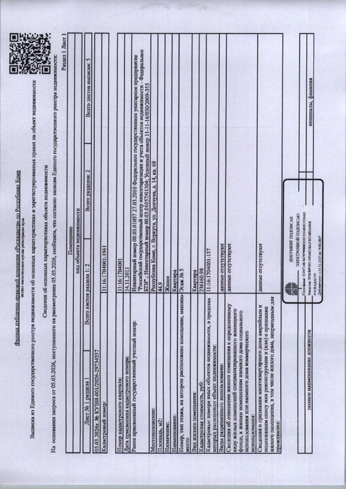 (90-02-25) Жилое помещение (квартира) общей площадью 44,9 кв,м., расположенное по адресу: Республика Коми, г. Воркута, ул. Дончука, д. 14, кв. 68, этаж 5, кадастровый номер 11:16:1704001:1961, вид права: собственность. Задолженность собственника по взносам за капитальный ремонт на 20.03.2026-26 777,98 руб. Имеется информация об отсутствии зарегистрированных лиц в жилом помещении. Должник Несмашный О.Н. Начальная цена: 439 900 рублей. Обременение: арест.