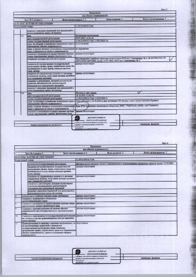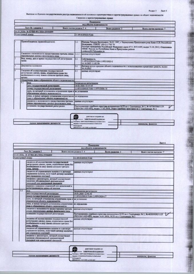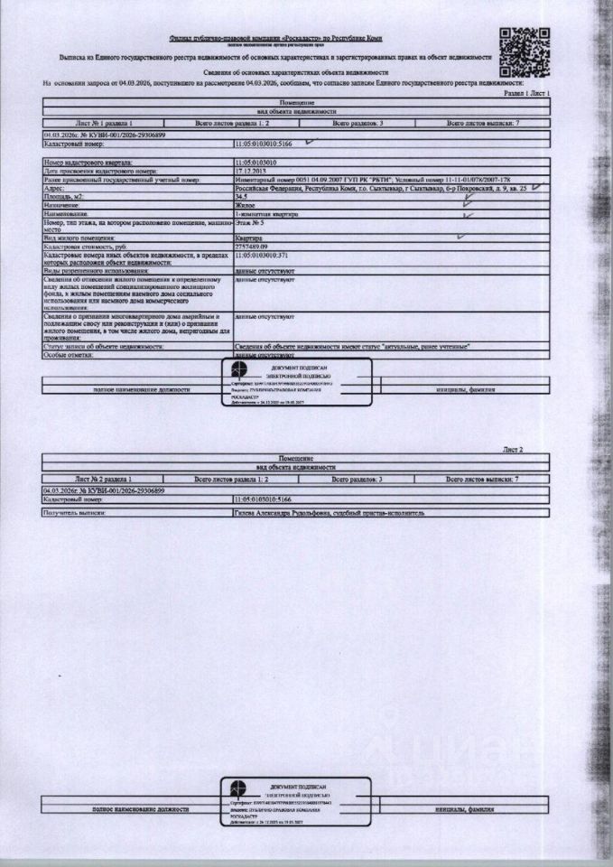 (31-25-26) Заложенное имущество - Жилое помещение (квартира) общей площадью 34,50 кв.м., расположенное по адресу: Республика Коми, г. Сыктывкар, Покровский б-р, д. 9, кв. 25, этаж 5, кадастровый номер: 11:05:0103010:5166, вид права: собственность. Начисление взносов за капитальный ремонт дома не осуществляется, квитанции не выставляются. Зарегистрированы 1 взр. Должник Жирнова Т.В. Начальная цена: 2 741 600 рублей. Обременение: арест, залог.
