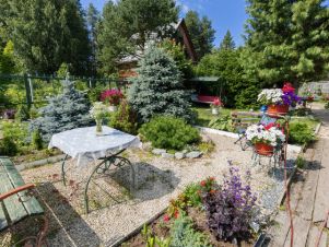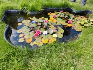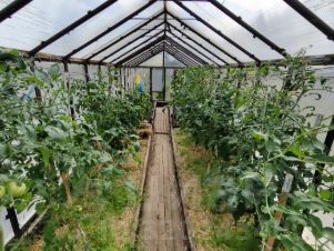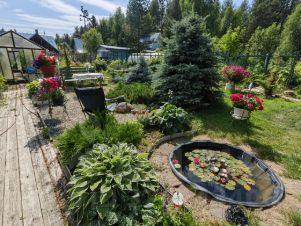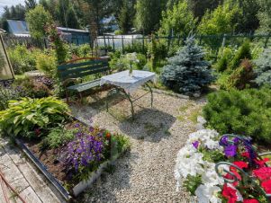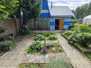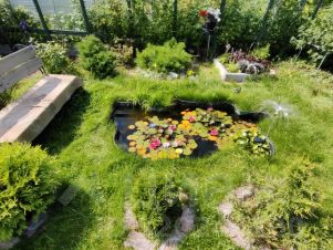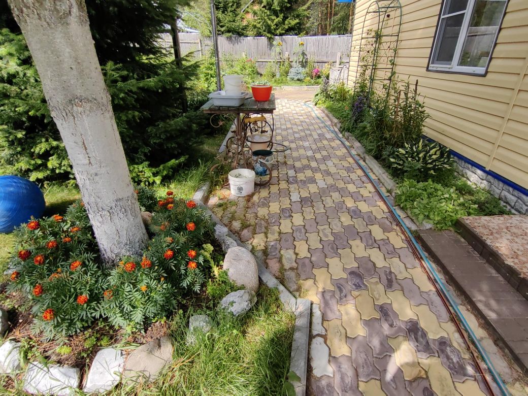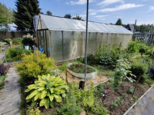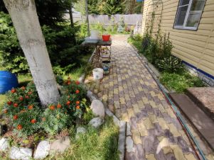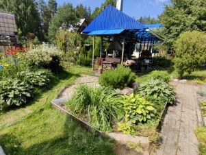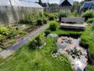 Земля разработана и отлично ухожена. Весь участок представляет собой прекрасный летний сад с массой различных растений. Всё красиво и с любовью, как на фото. Земля для удобства везде пересекается дорожками, выложенными брусчаткой. Есть два мини пруда с живущими в них кувшинками.
