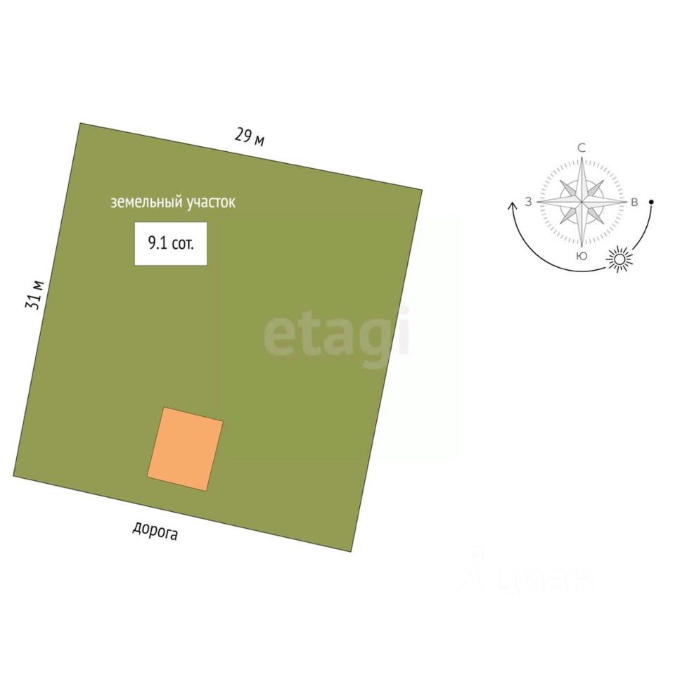 Земельный участок правильной почти квадратной формы 31х30м (9,14 сотки). Огражден забором по периметру, есть заезд на участок для автомобиля. Тихое место, нет шумных соседей.