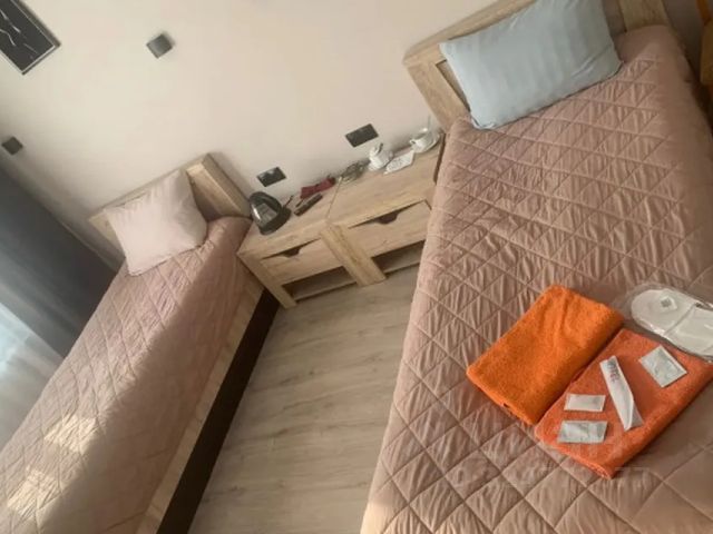 В номере: 2 кровати размером: 90х200, комплект постельного белья, прикроватные тумбы, шкаф-купе, стол, стулья, телевизор с плоским экраном 24-32 дюйма, Wi-Fi, электрический чайник, посуда, чай, кофе, сахар, отдельная ванная комната, душ кабина с гидромассажем, набор полотенец, средства индивидуальной гигиены (шампунь, мыло, гель для душа, тапочки).